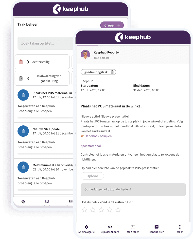 Ja, op basis van de rechtenstructuur en groepen in Keephub kun je taken sturen naar de hele organisatie, een specifieke locatie of een bepaalde groep medewerkers. Denk bijvoorbeeld aan een taak die alleen zichtbaar is voor vestigingsmanagers.