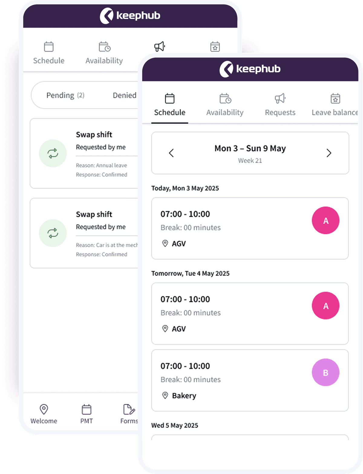 Statische roosters leiden tot last-minute paniek, onnodige telefoontjes en onnodig meer werk. Keephub voegt een zelfservicelaag toe bovenop je bestaande WFM, zodat kleine roosterproblemen worden opgelost voordat ze bij een manager belanden. Zo breng je autonomie terug op de werkvloer, zonder de controle te verliezen.